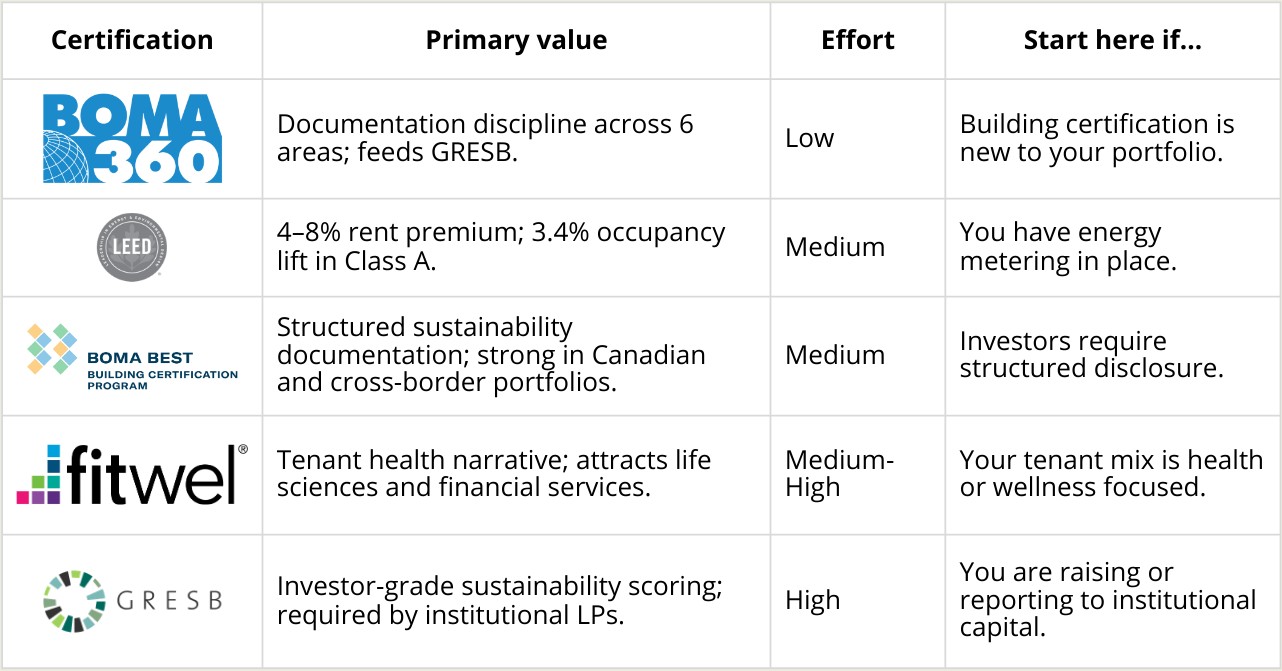 • BOMA first. It establishes operational efficiency as a baseline and positions the building for the next tier.