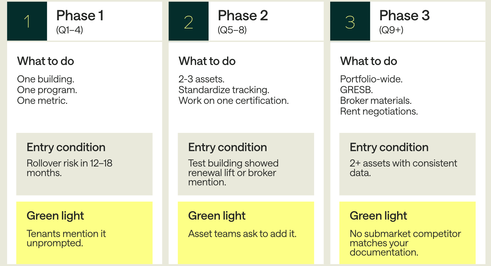 The program built in Step 1 becomes the story brokers tell in Step 3. The certification data from Step 2 becomes the sustainability summary that speaks to corporate tenants' disclosure requirements.