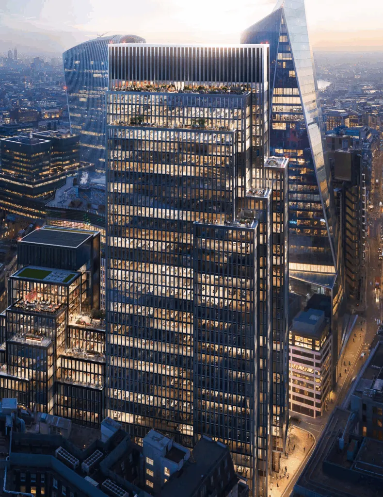 Nicknamed “Gotham City” for its striking silhouette, 40 Leadenhall is reshaping the eastern edge of the City skyline. With nearly 900,000 sq ft of premium office space, the building offers landmark architecture, rooftop terraces, a private cinema, and a wellness suite.